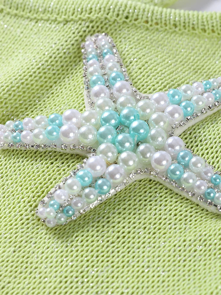 The Marina dress is summer romance woven into every stitch. Crafted in a chic knitted design, it features delicate pearl accents, playful tassel details, and starfish-inspired touches that give it an ocean-kissed glow. With its sleeveless, backless cut and flirty mini length, Marina brings the perfect blend of elegance and fun to your beachwear collection.