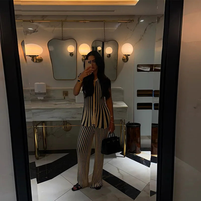 Meet your new wardrobe essential – the Zara Set. This effortlessly chic two-piece features a soft, lightweight V-neck top and perfectly tailored straight-leg pants. With its elegant striped design and breezy knitted fabric, it’s the ultimate blend of comfort and sophistication. Whether you’re commuting to work, enjoying a summer brunch, or lounging in style, this set has you covered.