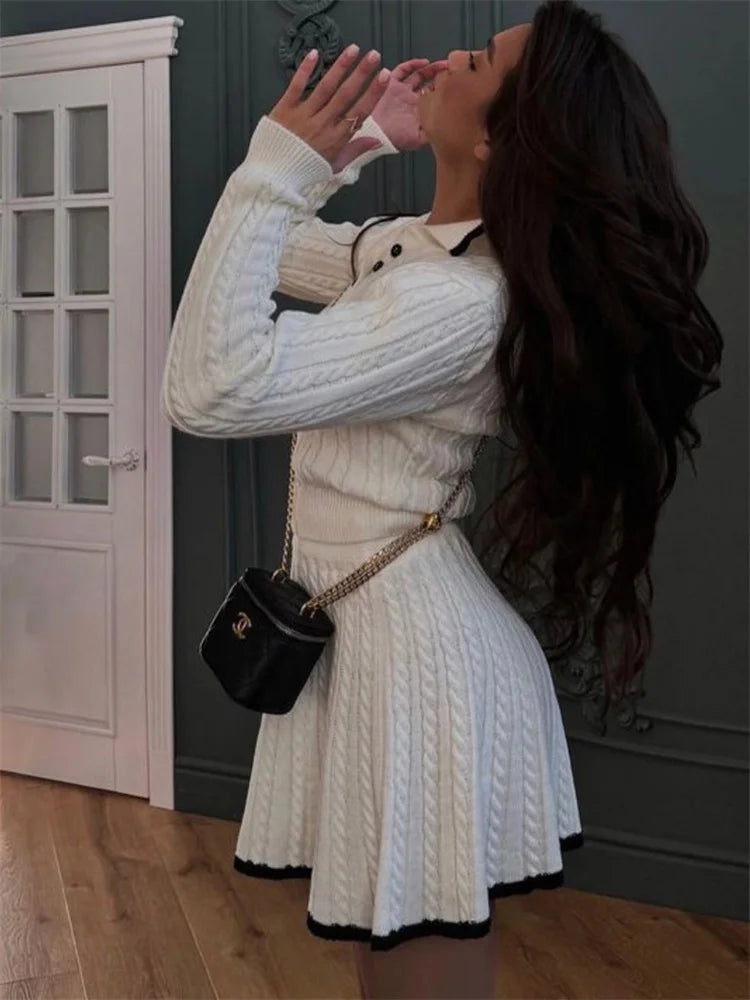 The Arden set redefines autumn chic with a playful twist. Featuring a contrast patchwork lapel pullover and a high-waist mini skirt, this two-piece combines cozy warmth with standout style. The bold mix of textures and sleek tailoring make it an effortless day-to-night look.